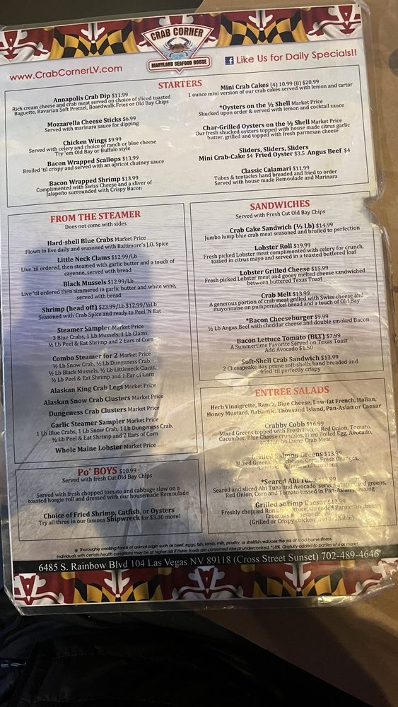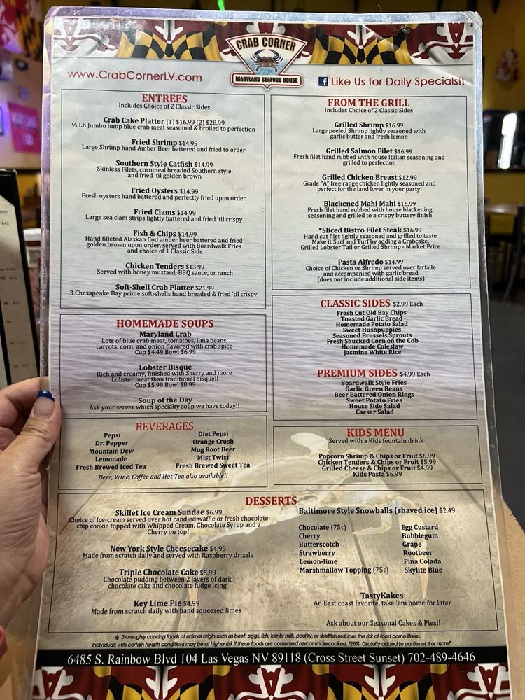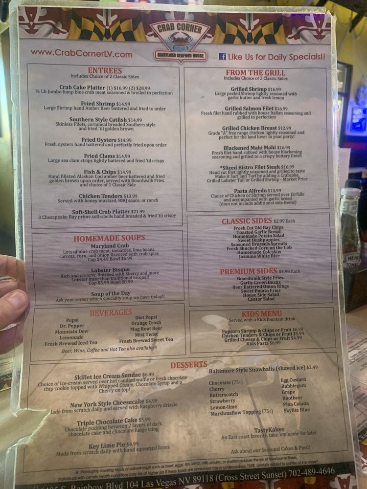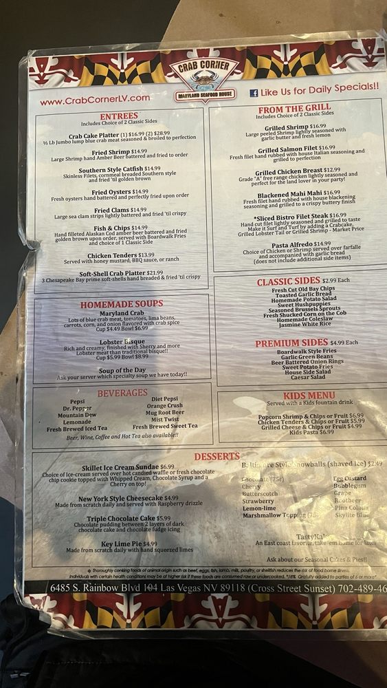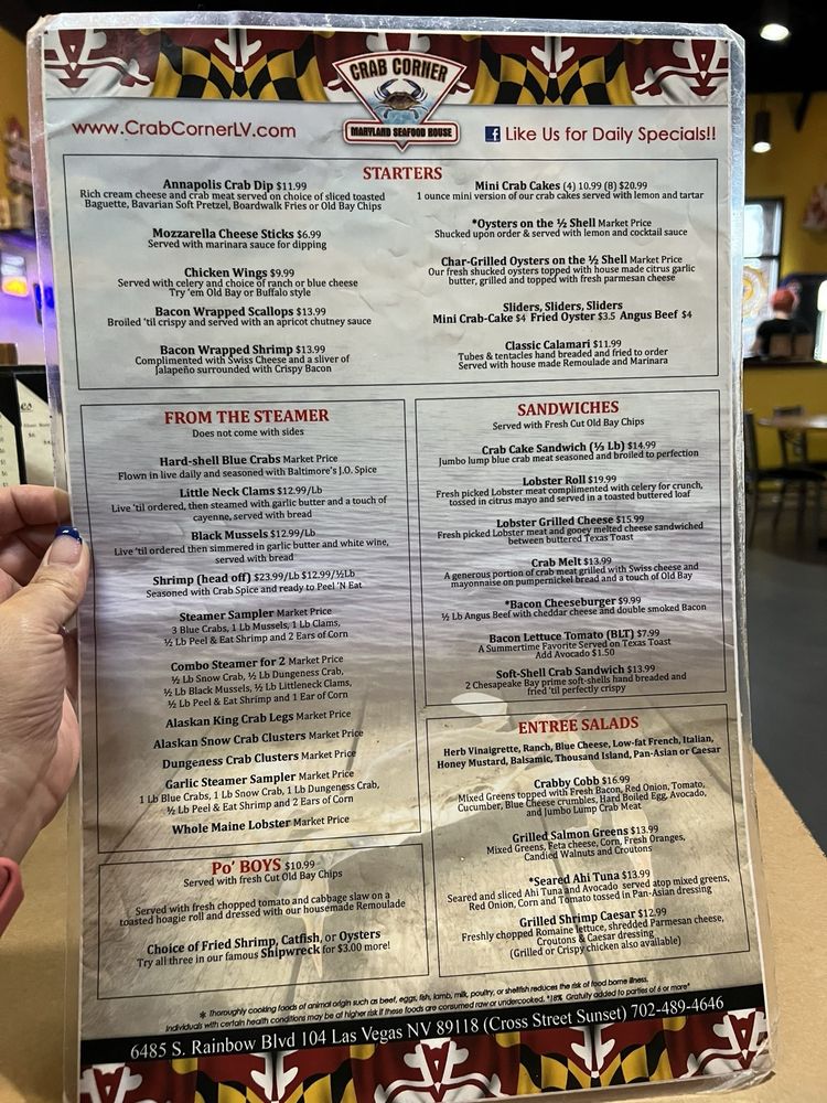Introducing Crab Corner, a seafood-focused restaurant in Las Vegas offering a variety of appetizers, sandwiches, salads, and entrées. Located at 6485 S Rainbow Blvd, this venue is wheelchair accessible and offers convenient amenities like delivery, takeout, and outdoor seating. The menu features enticing options such as Mini Crab Cakes, Lobster Grilled Cheese, and Southern Style Catfish. With a full bar, Happy Hour specials, and a cozy atmosphere, Crab Corner is perfect for groups, families, and solo diners alike. Don't miss out on their signature dishes like the Annapolis Crab Dip and SoftShell Crab Platter. Whether you're looking for a casual meal or a fun night out, Crab Corner has something for everyone. Join them on their best nights of Tuesday, Saturday, and Sunday for a memorable dining experience.